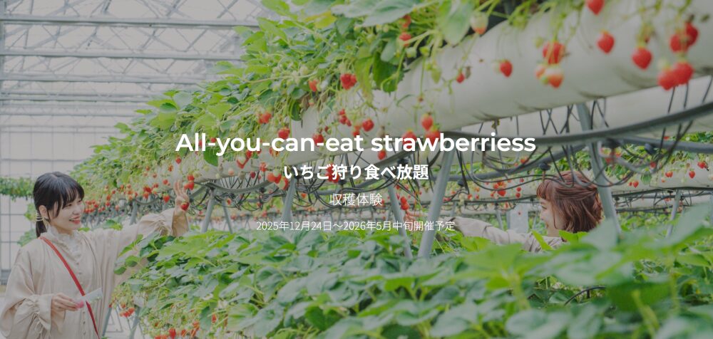 2025年12月27日から2026年5月中旬まで開園予定で、時期により料金が変動します。営業時間は9:00~17:00で、予約制ではなくいちごがなくなり次第終了となるため、お早めの来園がおすすめです。