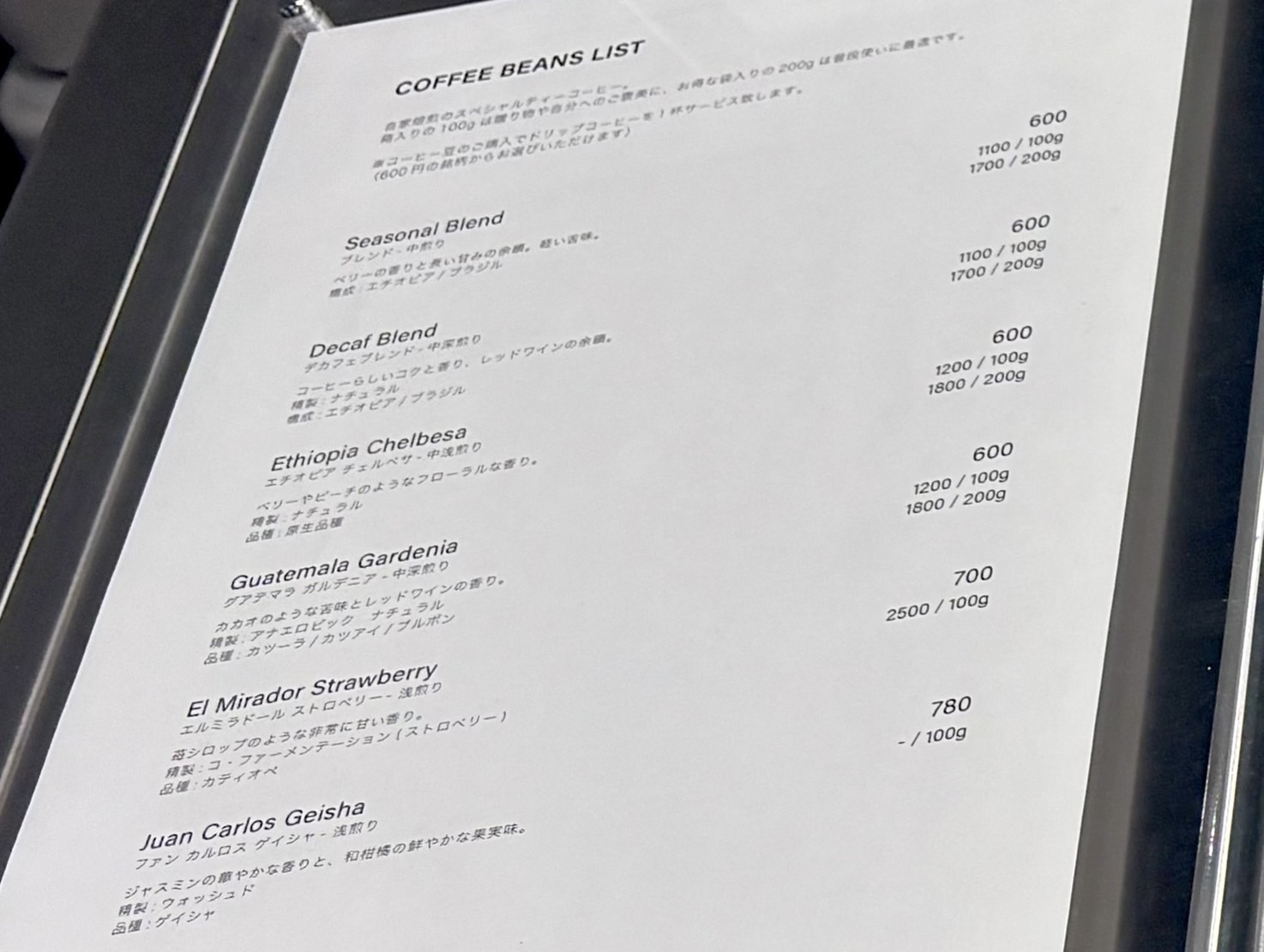 ドリンクメニューも豊富で、コーヒーはなんと6種類。自分の好みや、選んだスイーツに合わせて豆を選べるのが魅力です。
